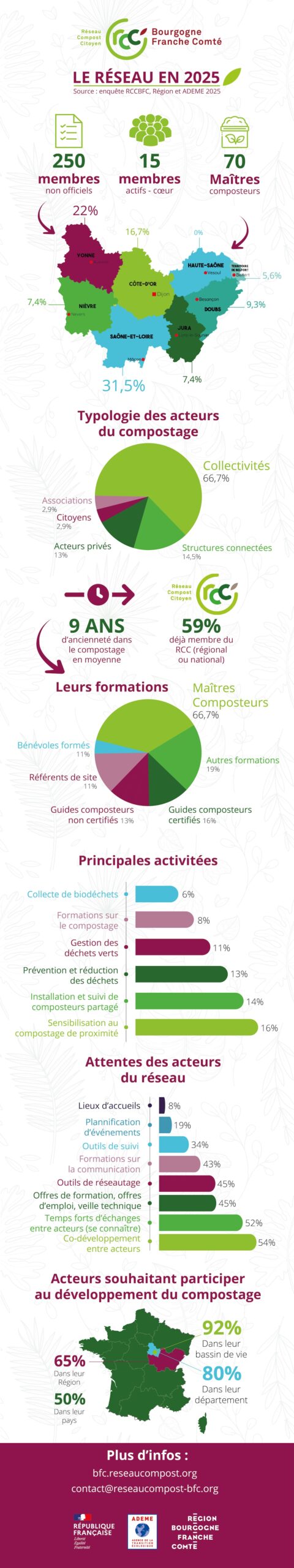 Antenne régionale du Réseau Compost Citoyen National, le réseau BCF a été crée en 2023 à l’initiative d’association de la region impliqués dans le compostage de proximité. Le réseau s’est ensuite professionnalisé en 2025 avec le soutien de la région Bourgogne-Franche-Comté et de l’Ademe. Nos adhérents rassemblent des citoyens, des professionnels, des collectivités, des structures publiques comme privées, répartis sur l’ensemble de la région.